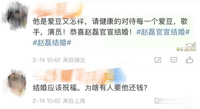 赵磊官宣结婚同团成员排队祝福,却有粉丝评论区留言让赵磊还钱