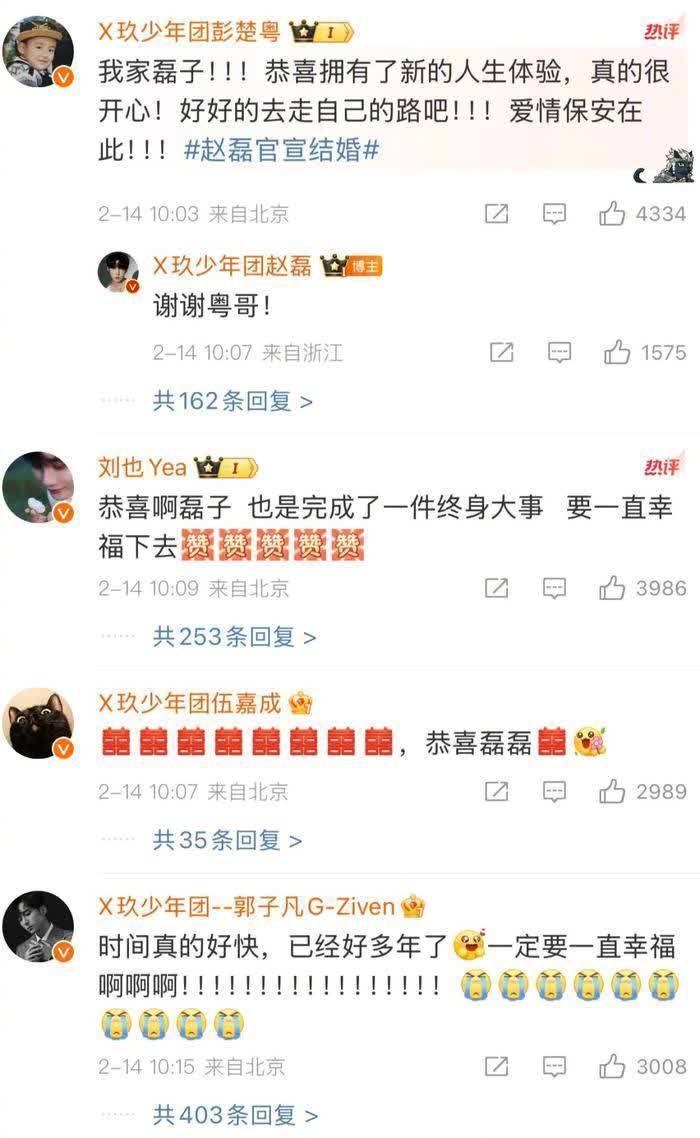 赵磊官宣微博的评论区,同团成员和其圈内好友排队送祝福↓↓